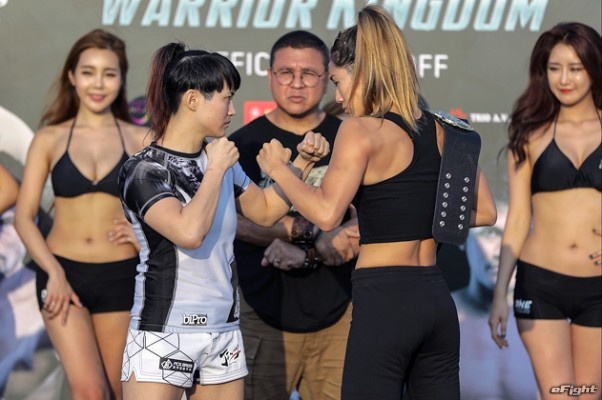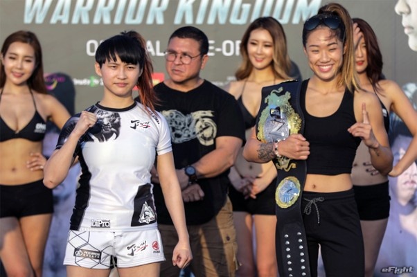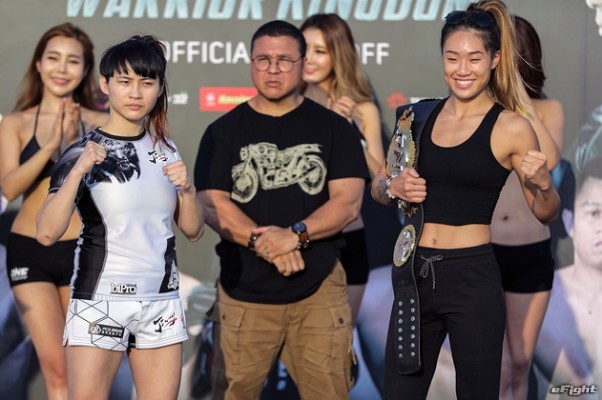 高層ビルから見下ろす首都バンコクの眺望を背景に闘志を燃やすリー(左)とフアン(右)
