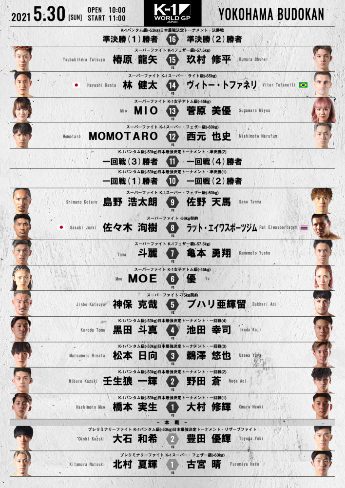 『K-1 WORLD GP 2021 JAPAN~K-1バンタム級日本最強決定トーナメント~』全試合順(C)K-1