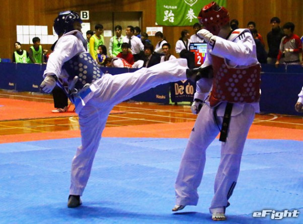 東京五輪出場を目指しテコンドーの大会に挑戦した時の菊野克紀(左)