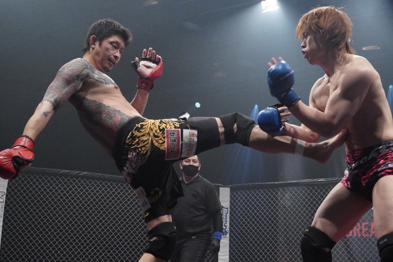 蹴りを放つ啓之輔(2022年3月)