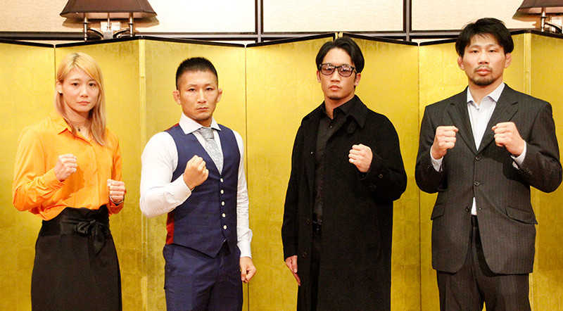 カード決定会見で並ぶ左から渡辺華奈、元谷友貴、朝倉未来、中村K太郎
