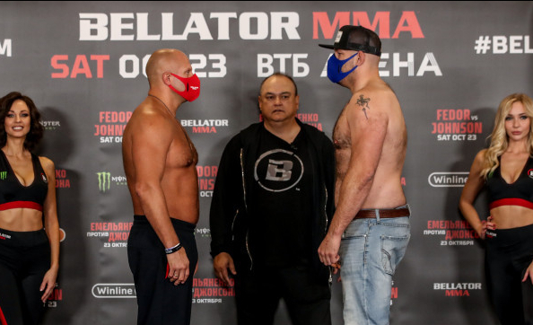 計量パスし、向かい合うヒョードル(左)とジョンソン(右)©️Bellator
