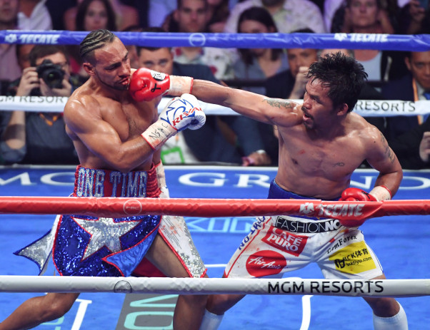 無敗のスーパー王者に40歳パッキャオが伸びのあるストレートを叩き込む。ダウンを奪い王座を奪取した=19年7月(c)getty