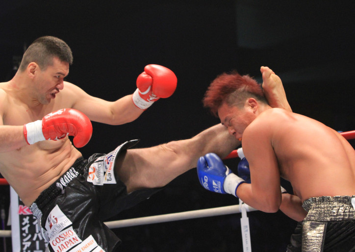 前戦、強烈なハイキックをK-Jee(左)に蹴りこむ加藤