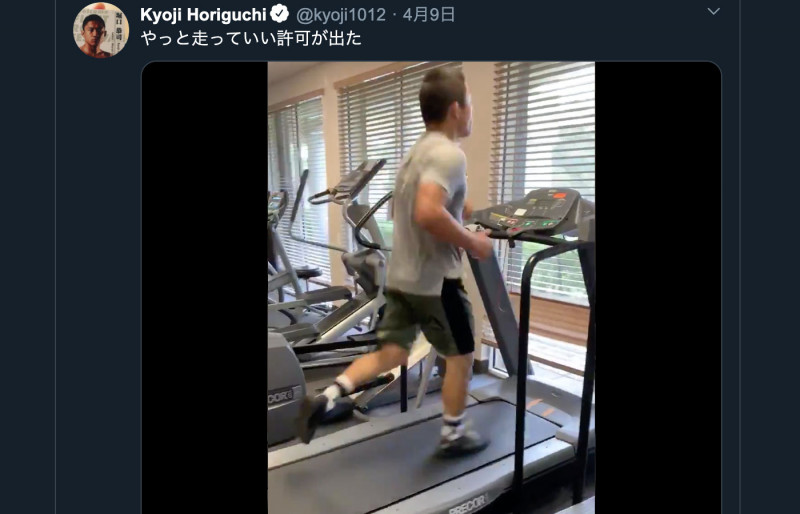 現在リハビリ中の堀口恭司は、昨年10月のヒザ負傷からランニングマシンでダッシュできるまでに回復(@kyoji1012より)