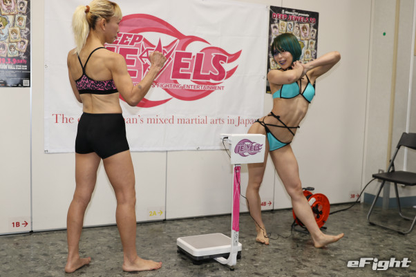 計量でポーズを決めるマドレーヌ(右/19年3月)