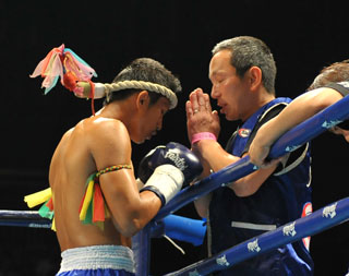▲日本の試合では常に高津が、タイ式仏教のお経を唱えてからゲーオのモンコンを外す