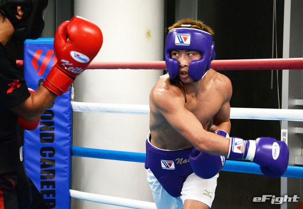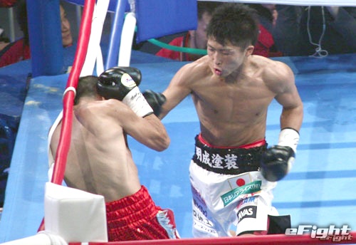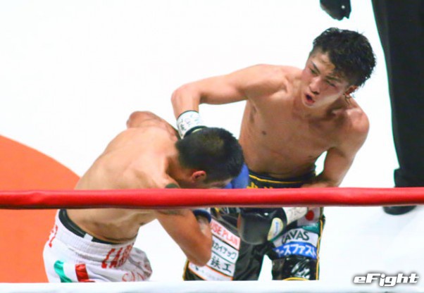 強烈な左ボディブローをニエベス(右)に何度も叩き込み、米国デビュー戦をTKO勝利で飾った井上尚弥(写真:日刊スポーツ/アフロ)