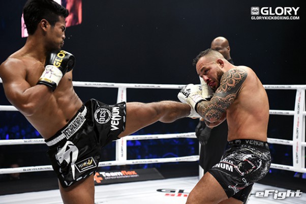 GLORY2階級制覇・ロスマレン(右)を伝家の宝刀・左ミドルで攻め立て王座を奪ったペットパノムルン(左)