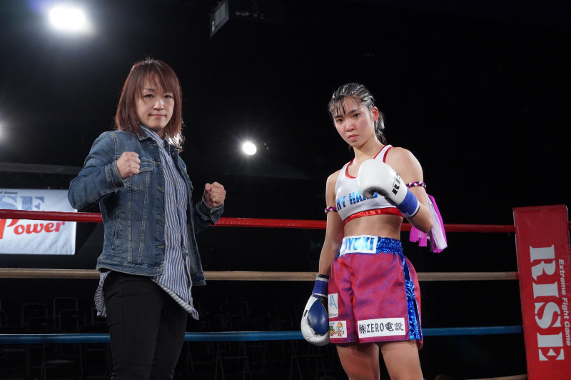 紅絹(左)とトーナメントを制しリングで宣戦布告をした宮崎