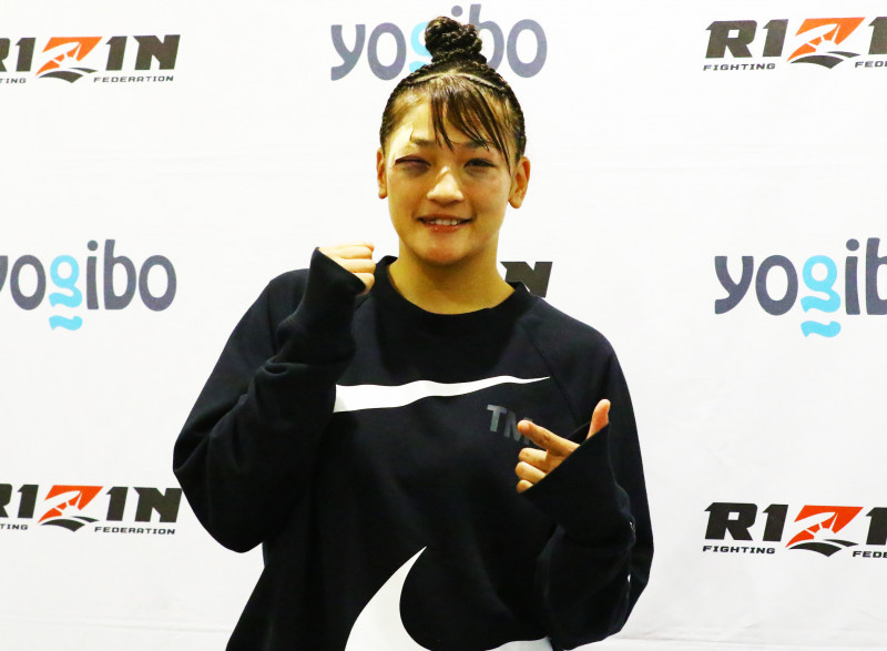 笑顔でシュートサインを出すRENAだが、ダメージを負った顔から激闘を感じさせる