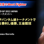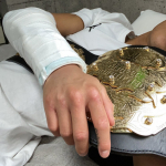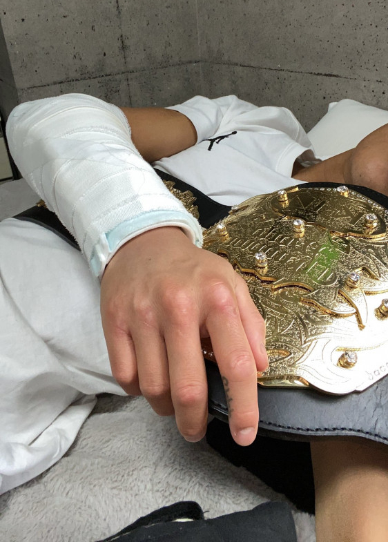 骨折した腕でベルトを抱く黒田斗真(本人提供)
