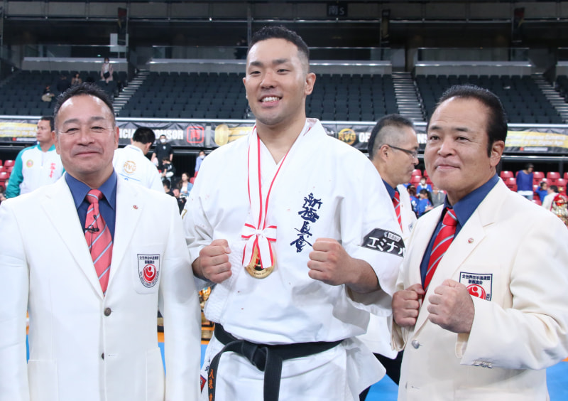優勝した入来建武(中央)、師範である父・武久氏(右)、新極真会・緑健児代表(左)
