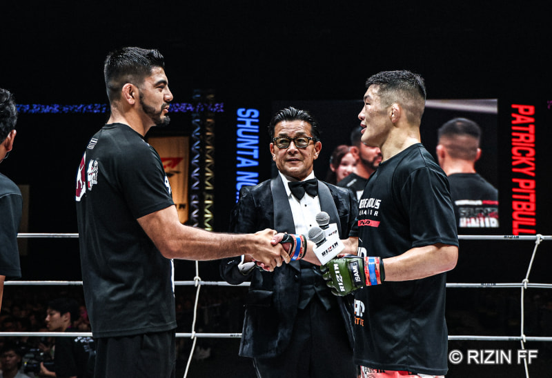 RIZINのリング上で握手を交わすサトシ(左)と野村(右)