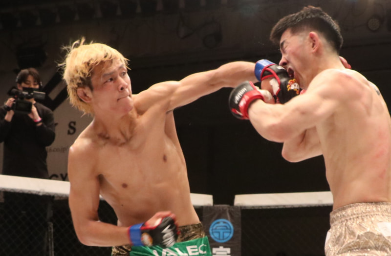 フェザー級GP二回戦、海飛に強烈なパンチを当てる水野