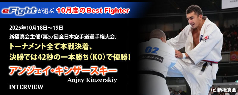 毎月イーファイトのサイト名にちなみ、より良い試合をした選手に贈られる、格闘技月間ベストファイター賞。2025年9月のベストファイターは、10月18日~19日、東京体育館にて、新極真会主催『第57回全日本空手道選手権大会』にて、トーナメント全て本戦決着、決勝ではわずか42秒 顔面飛びヒザ蹴りで衝撃の一本勝ち(KO)で優勝したアンジェイ・キンザースキー(カザフスタン)に決定した(2025年11月28日UP)