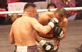 後半に行くに従って王者は、打ち終わりに緑川のカウンターをもらうと、クリンチに来る場面が目立った。