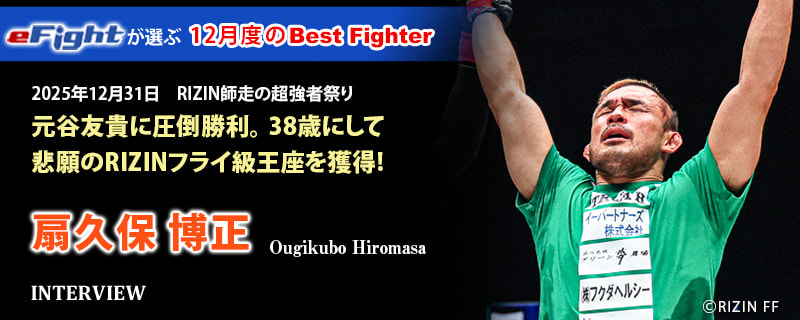 毎月イーファイトのサイト名にちなんでより良い試合をした選手に贈られる、格闘技月間ベストファイター賞。2025年12月のベストファイターは、12月31日(水)埼玉・さいたまスーパーアリーナにて開催された『Yogibo presents RIZIN師走の超強者祭り』の[フライ級タイトルマッチ(RIZIN MMAルール:5分3R/57.0kg)]で、元谷友貴(36=アメリカン・トップチーム)を判定3-0で下し、悲願のRIZINフライ級王者に輝いた扇久保博正(38=THE BLACKBELT JAPAN)に決定した。(2026年1月31日UP)