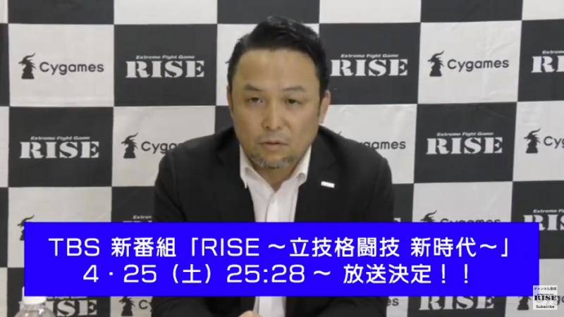 『RISE~立技格闘技 新時代~』を告知する伊藤代表と番組告知のテロップ