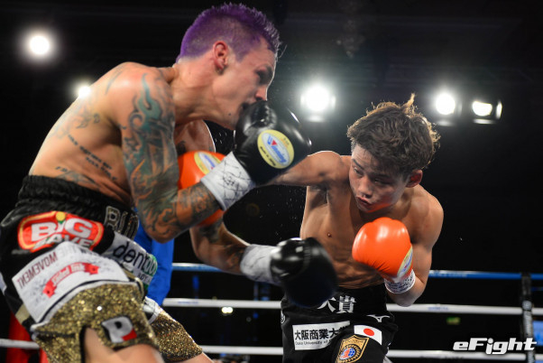 18年大晦日、王者ブドラーをボディで苦しめTKO勝利で王座となった京口(右)