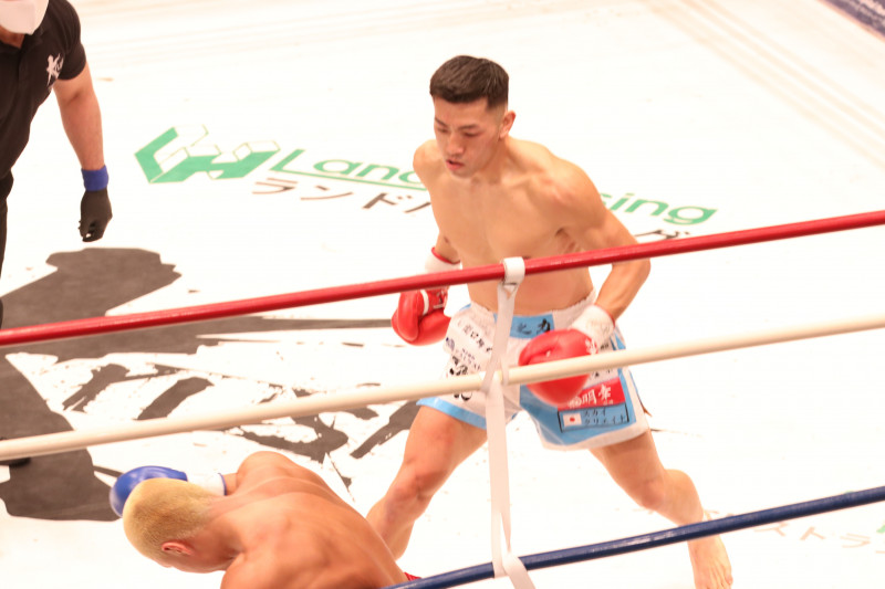 中島の強烈なパンチとヒザ蹴りで友尊がダウン