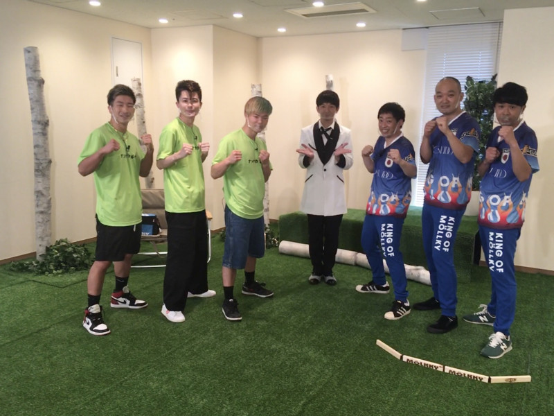 『キングオブモルックのモルック大作戦!!』に出演する(左から)梅井泰成、大谷廉太、那須川天心、向井慧、森田哲矢、みなみかわ、カナイ