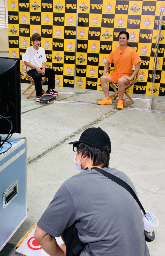 堀米(左)の収録中、ADに変装していた那須川(手前)(C)TBS