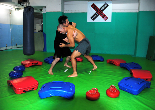 川村(右)は近藤(左)とミットで作った土俵での相撲特訓を披露した