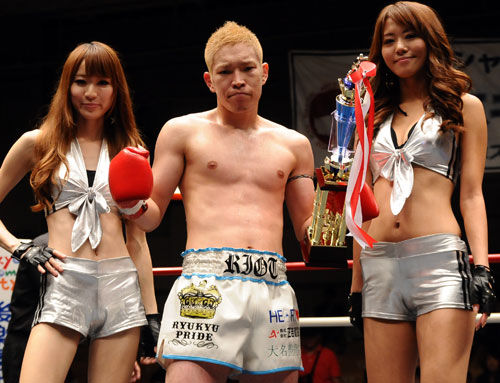 沖縄キックボクシング界のエースRIOT(中央)が引退試合を迎える
