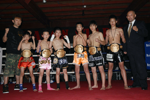 6月に誕生したドラゴンスタジアム認定王者(左から)DRAGON GYM・佐藤亮会長、笠井流都、佐藤太陽、佐高仁、伊藤滉基、瀬野尾亜月、熊井亮介、石垣慎壱イベントプロデューサー
