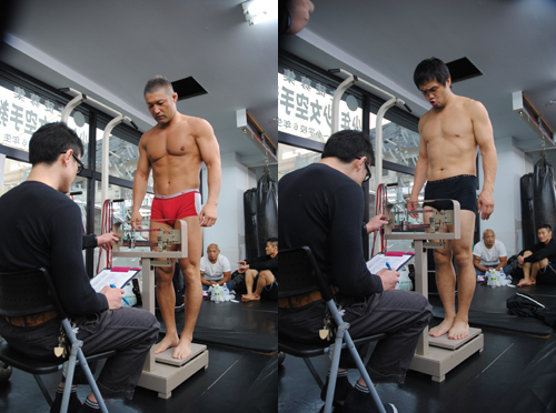 ▲計量をパスし、明日のメインイベントのゴングを待つのみとなった桜井(左)と中村(右)