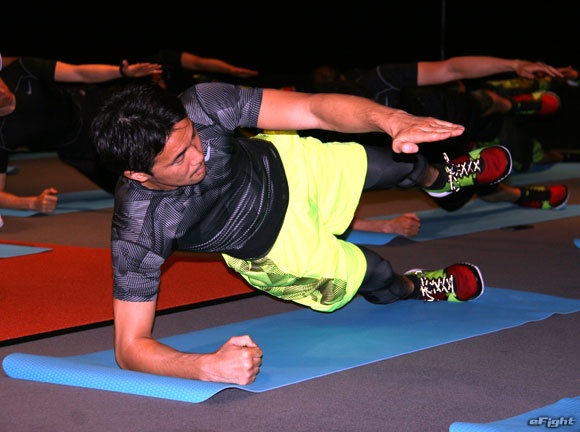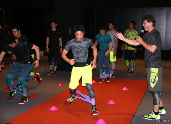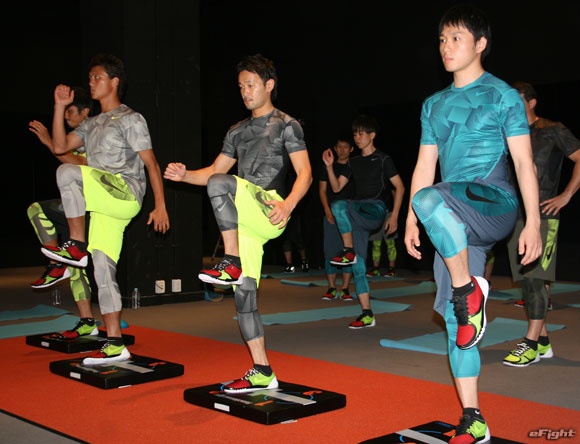 ▲柔らかいマットの上で片足立ちになり、バランスを保つトレーニング