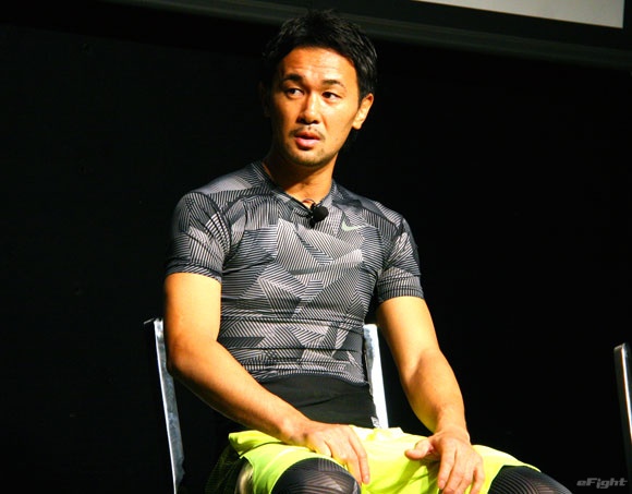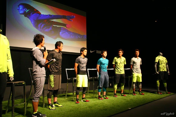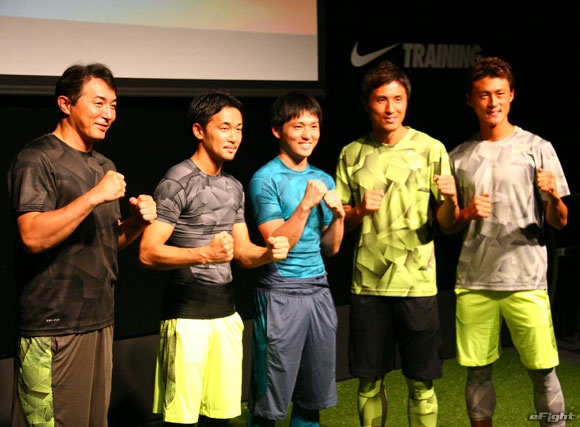 ▲イベントに参加した(左から)トレーナーの木場克己氏、山中、トランポリン日本代表の伊藤正樹、フットボール選手の那須大亮、李忠成