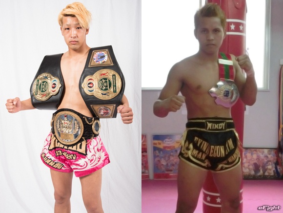 ▲WINDY MUAYTHAIライト級初代王座決定戦で対戦する晃希(左)とメーン・ウォーワンチャイ(右)