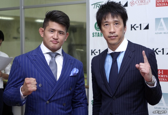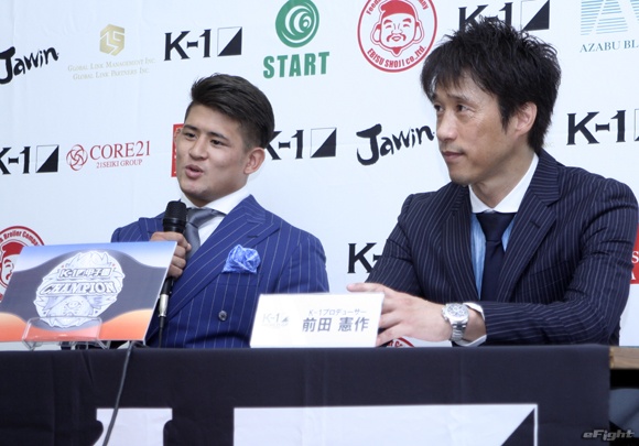 ▲K-1甲子園のイベントサポーターに就任したHIROYA(左)と前田憲作プロデューサー(右)