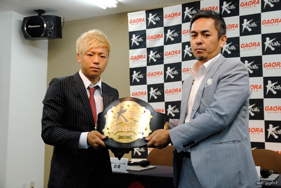 ▲3度防衛したKrush王座を宮田プロデューサー(右)に返上した武尊(左)