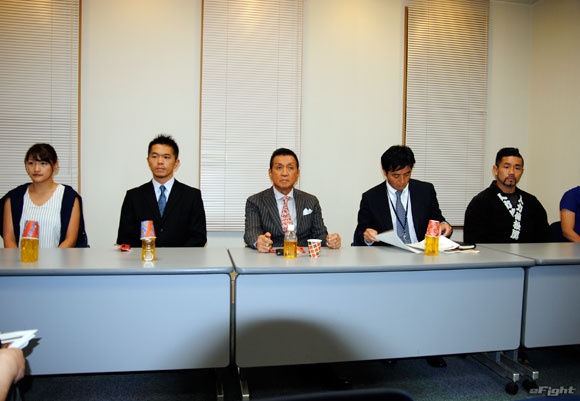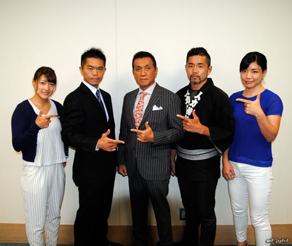 ▲(左から)会見に出席したRENA、宍戸、シーザー会長、坂本、高橋