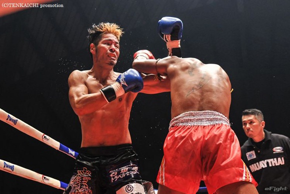 5月のWPMF世界スーパーウェルター級王座決定戦でデッバンジョン(右)と激闘を繰り広げた廣虎(左)
