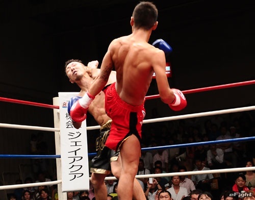 加藤竜二(手前)の最後の試合となった2014年7月のREBELS 52.5kg級王座決定戦