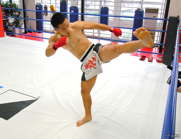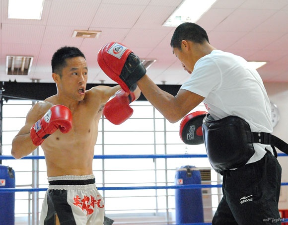 一発一発全力の重いパンチをミットに叩き込むシューソン。スピードもある