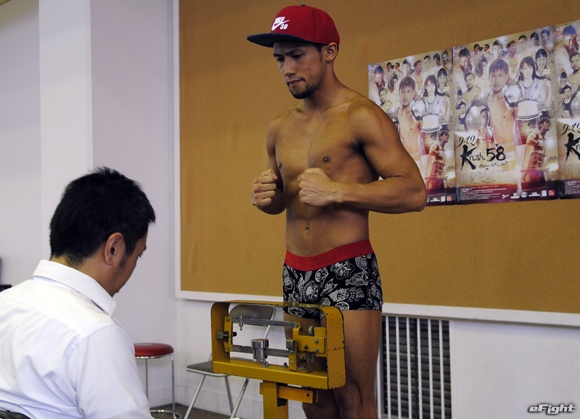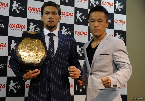 Krush-60kgタイトルマッチで対戦する王者・卜部弘嵩(左)と挑戦者の英雄伝説世界-57kg王者ジュアン・シューソン(右)は共に計量をクリアー