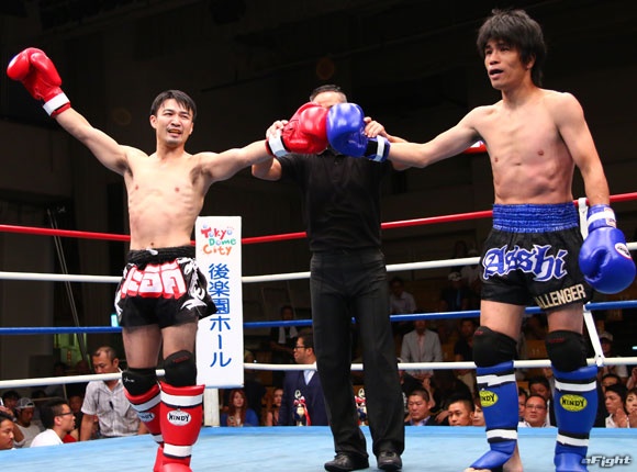 立嶋篤史(右)を相手に引退エキシビジョンマッチを行った長嶋(左)