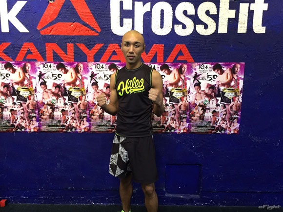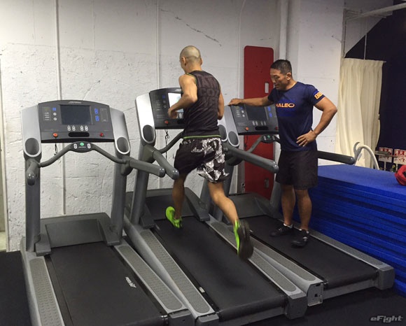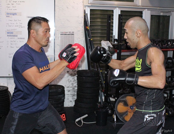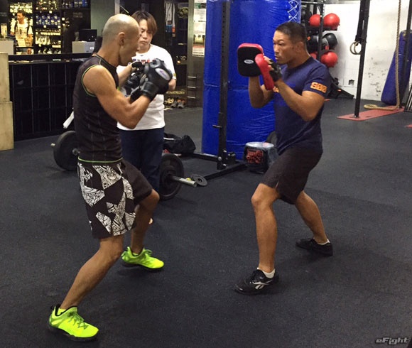 元PRIDE王者・三崎和雄(左)の持つミットへパンチを叩き込む山内(右)
