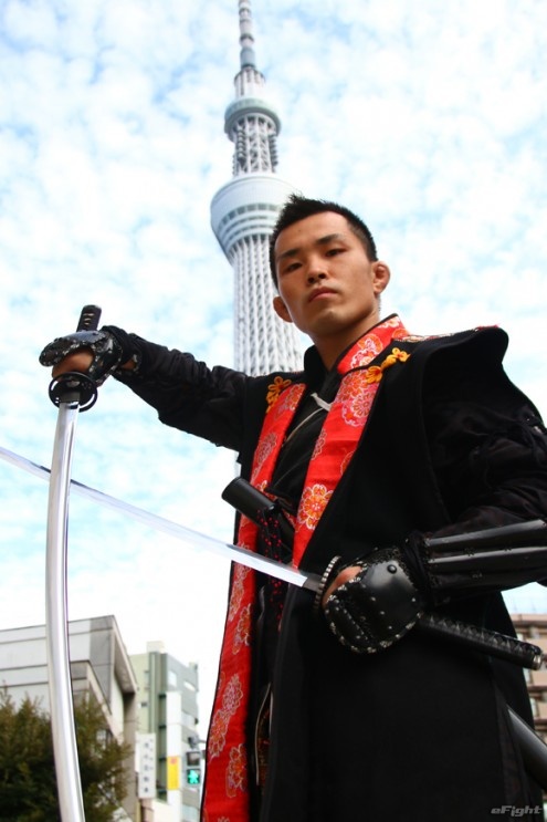 スカイツリーをバックに、入場時に着用する甲冑姿でポーズを決める元修斗世界バンタム級王者・神酒龍一