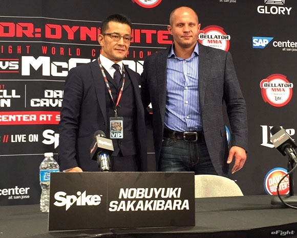 9月19日アメリカで開催されたMMA&キックボクシング大会『Bellator 142 Dynamite 1』の大会内で大みそか格闘技イベントの開催を発表した元PRIDE代表の榊原氏(左)と、そのイベントで現役に復帰することを発表したヒョードル(右)