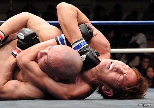 得意のスリーパーホールドによる全試合一本勝ち優勝を宣言している佐々木