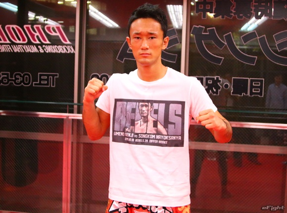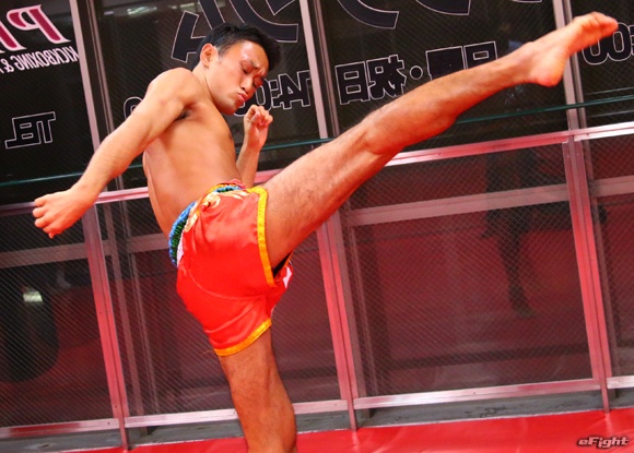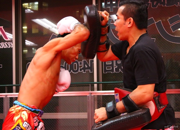 公開練習でミット打ちを披露したWBCムエタイ世界スーパーフェザー級王者・梅野源治(左)