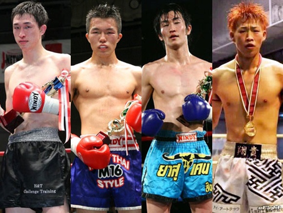 初代蹴拳ムエタイフェザー級王者決定トーナメントに出場する(左から)久世秀樹、プンダムM16、山元幸也、翔貴