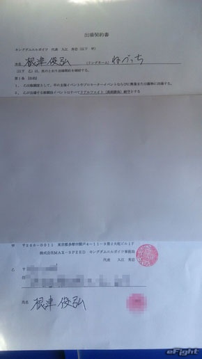 プレスリリースに添付された契約書の写真。真剣勝負の試合を行う旨が記されている