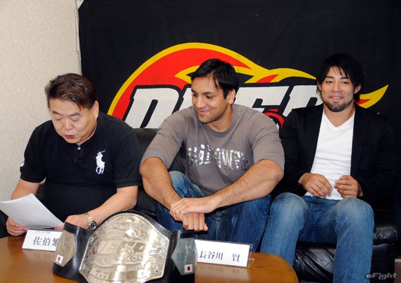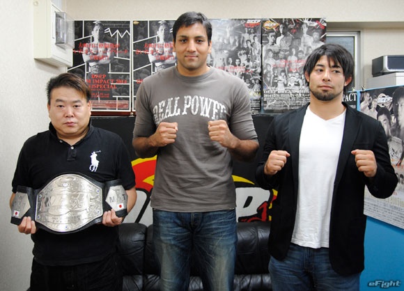 トヨタとの王座決定戦に臨むシング(中央)。右は練習仲間でもある元DEEPメガトン級王者・長谷川賢、左は佐伯代表